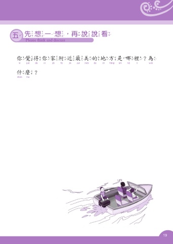 四 句子練習 五 先想一想,再說說看 Sentence exercise Please think and discuss ( 一 )句型練習Sentence practice 你覺得你家附近最美的地方是哪裡? 為 你覺得你家附近最美的地方是哪裡 為 我 們 這難得一見的 畫面 什麼? 我們 這難得一見的 畫面 什麼 被 大海 給 迷住了。 被 大海 給 迷住了 煙火 煙火 (二)感嘆句練習Exclamation sentence exercise 1. 看哪! 看哪 2. 啊! 啊 1 1