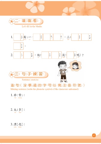 㳧!䡹䡹䉃 Let's ¿ll in the blanks 1. ఫ㹫㳠 ࿒ ఝ 䦆 Ă㳴 ࿒ ഗ ! ୧ড়! ! ! ৰ 㷷 Ą 2. ഌ Ă㶉 ຬ ᢇ 㽧 ು䀀ĉ ! ! અ! ౣ!! 㳴!㶶濴䱢䗳 Sentence exercise 䙌㶶Ğ㽧䴷䧍䃦㹌㶦㶅䮿䂮䊸䗙䥻ğ Making sentence (write the phonetic symbols if the characters unlearned) 1. 䄯䓹Ĉ หᇵ 2. 㵑㹂Ĉ ੍ା 3. 絖䄲Ĉ 䩒ฮ 17
