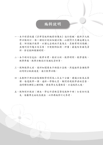 四、 本教師手冊安排每課教學時間為二百五十分鐘,建議分配為五節