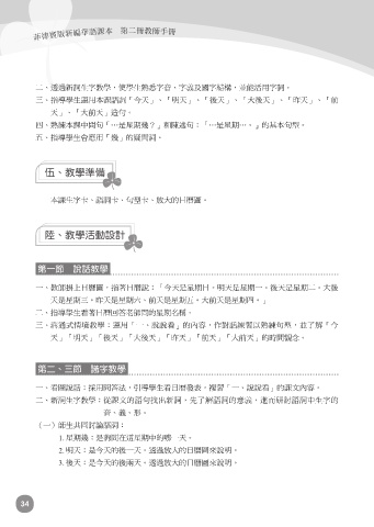 一、 教師掛上日曆圖,指著日曆說:「今天是星期日。明天是星期一。後天是星期二。大後