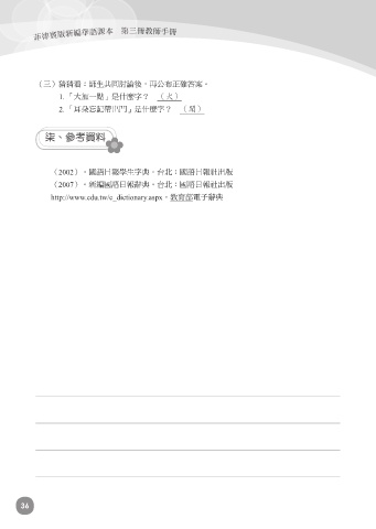 菲律賓版新編華語課本 第三冊教師手冊 (三)猜猜看:師生共同討論後,再公布正確答案。 1. 「大加一點」是什麼字? (犬) 2. 「耳朵忘記帶出門」是什麼字? (聞) 柒、參考資料 (2002)。國語日報學生字典。台北:國語日報社出版 (2007)。新編國語日報辭典。台北:國語日報社出版 http://www.edu.tw/e_dictionary.aspx。教育部電子辭典 36