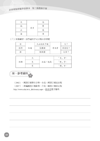 菲律賓版新編華語課本 第三冊教師手冊 天 高 地 厚 有多 山 高 海 深 (三)替換練習:沒學過的字可以寫注音符號 你 火山的肚子裡 火? 你們 知道 花園裡 有沒有 茉莉花? 誰 動物園 大象? 火 「炎」字。 兩個 木 加在一起是 「林」字。 月 「朋」字。 柒、參考資料 (2002)。國語日報學生字典。台北:國語日報社出版 (2007)。新編國語日報辭典。台北:國語日報社出版 http://www.edu.tw/e_dictionary.aspx。教育部電子辭典 54