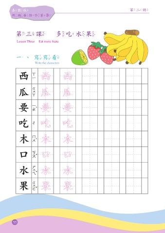 泰國版 第二冊 新編華語作業簿 第三課 多吃水果 Lesson Three Eat more fruits 一、寫寫看 Write the characters 西 西 瓜 瓜 要 要 吃 吃 木 木 口 口 水 水 果 果 11