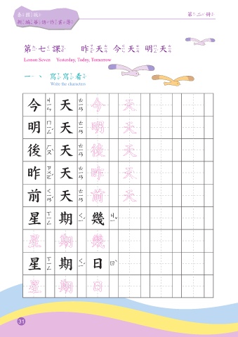 泰國版 第二冊 新編華語作業簿 第七課 昨天 今天 明天 Lesson Seven Yesterday, Today, Tomorrow 一、寫寫看 Write the characters 今 今 天 天 明 明 天 天 後 後 天 天 昨 昨 天 天 前 前 天 天 星 星 期 期 幾 幾 星 星 期 期 日 日 31