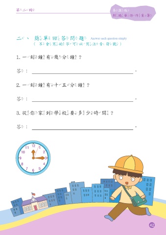第二冊 泰國版 新編華語作業簿 二、簡單回答問題 Answer each question simply (不會寫的字可以寫注音符號) 1. 一刻鐘有幾分鐘? 答: 。 2. 一刻鐘有十五分鐘? 答: 。 3. 從你家到學校要多少時間? 答: 。 42