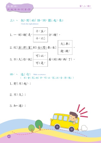 泰國版 第二冊 新編華語作業簿 三、把對的語詞圈起來 Circle the right phrases 十五 1. 一刻鐘是 分鐘。 十六 火車 2. 從菲律賓到台灣要坐 。 飛機 可以 3. 不久你就 看到媽媽了。 可是 四、造句 Make a sentence (不會寫的字可以寫注音符號) 1. 對不起: 2. 不久: 3. 知道: 43