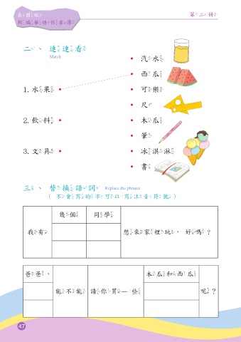 泰國版 第二冊 新編華語作業簿 二、連連看 Match ‧ 汽水 西瓜 ‧ 1. 水果‧ ‧ 可樂 ‧ 尺 2. 飲料‧ ‧ 木瓜 筆 ‧ 3. 文具‧ ‧ 冰淇淋 書 ‧ 三、替換語詞 Replace the phrases (不會寫的字可以寫注音符號) 幾個 同學 我有 想來家裡玩,好嗎? 爸爸, 木瓜和西瓜 能不能 請你買一些 呢? 47