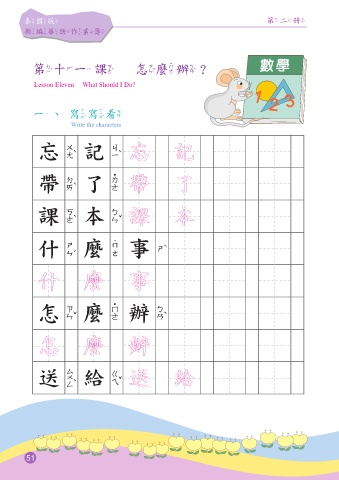 泰國版 第二冊 新編華語作業簿 第十一課 怎麼辦? Lesson Eleven What Should I Do? 一、寫寫看 Write the characters 忘 忘 記 記 帶 帶 了 了 課 課 本 本 什 什 麼 麼 事 事 怎 怎 麼 麼 辦 辦 送 送 給 給 51