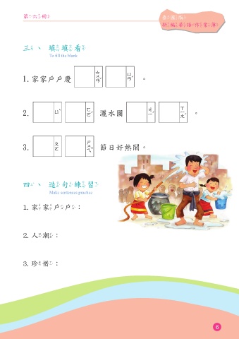 第六冊 泰國版 新編華語作業簿 三、填填看 To fill the blank 圓 團 1. 家家戶戶慶 。 佛 浴 祥 吉 2. 灑水圖 。 水 潑 3. 節日好熱鬧。 四、造句練習 Make sentences practice 1. 家家戶戶: 2. 人潮: 3. 珍惜: 6
