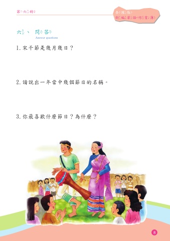 第六冊 泰國版 新編華語作業簿 六、問答 Answer questions 1.宋干節是幾月幾日? 2.請說出一年當中幾個節日的名稱。 3.你最喜歡什麼節日?為什麼? 8