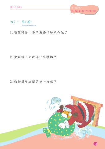 第六冊 泰國版 新編華語作業簿 六、問答 Answer questions 1.過聖誕節,要準備些什麼東西呢? 2.聖誕節,你收過什麼禮物? 3.你知道聖誕節是哪一天嗎? 12