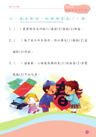 第六冊 泰國版 新編華語作業簿 六、選出對的,把號碼寫在()裡 Choose the correct one and write the numbering the brackets 1.( )農曆新年又叫做(1)春節(2)春假(3)新春。 2. ( )為了表示年年高升,所以要吃(1)發糕(2)菜 頭糕(3)年糕。 3. ( )過春節,小孩最高興的是(1)說恭喜(2)拿壓 歲錢(3)可以吃魚。 16
