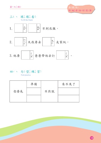 第六冊 泰國版 新編華語作業簿 三、填填看 To fill the blank 我 找 1. 不到衣服。 朋 明 2. 天我要去 友家玩。 求 求 3.他要 爸爸帶他去打 。 四、句型練習 Font practice 準備 來不及了 你要先 不然就 18