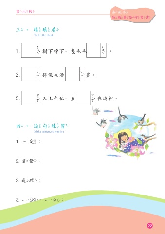 第六冊 泰國版 新編華語作業簿 三、填填看 To fi ll the blank 蟲 從 1. 樹下掉下一隻毛毛 。 記 計 2. 得做生活 畫。 昨 坐 3. 天上午他一直 在這裡。 四、造句練習 Make sentences practice 1. 一定: 2. 愛惜: 3. 道理: 3. 一分…一分: 22