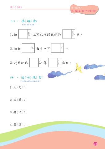 第六冊 泰國版 新編華語作業簿 三、填填看 To fill the blank 國 圖 1. 地 上可以找到我們的 家。 原 原 2.姐姐 來有一百 。 拿 文 3. 趕快把作 簿 出來。 四、造句練習 Make sentences practice 1. 大約: 2. 畫圖: 3. 痛快: 4. 整理: 38