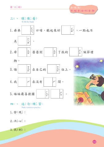 第六冊 泰國版 新編華語作業簿 三、填填看 To fi ll the blank 吵 吹 1. 弟弟 口哨,聽起來好 ,一點也不 妙 美 。 聖 望 望 2. 希 爸爸別 了我的 誕節禮 物。 坐 坐 3.請 在自己的 位上。 實 實 4.我 在沒有 間。 畫 書 5.妹妹最喜歡圖 。 四、造句練習 Make sentences practice 1. 發現: 2. 決心: 3. 找到: 42