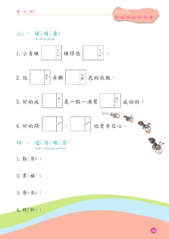 第六冊 泰國版 新編華語作業簿 三、填填看 To fi ll the blank 琴 琴 1.小青練 練得很 。 怕 白 2.他 弄髒 色的衣服。 績 績 3. 好的成 是一點一滴累 成功的。 始 使 4. 好的開 , 他更有信心。 四、造句練習 Make sentences practice 1. 勤勞: 2. 累積: 3. 原來: 4. 終於: 46