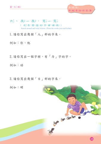 第六冊 泰國版 新編華語作業簿 六、找一找,寫一寫 (從你讀過的字裡頭找) Search around and write it down. (From the works you read before) 1.請你寫出幾個「人」部的字來。 例如:你、他 2.請你寫出一個字裡,有「力」字的字。 例如:功 3.請你寫出幾個「日」部的字來。 例如:明 48