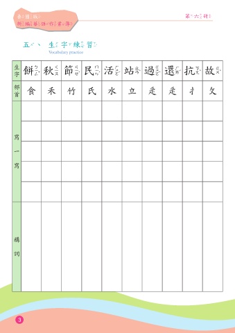 泰國版 第六冊 新編華語作業簿 五、生字練習 Vocabulary practice 生 餅 秋 節 民 活 站 過 還 抗 故 字 部 食 禾 竹 氏 水 立 辵 辵 扌 攵 首 寫 一 寫 構 詞 3
