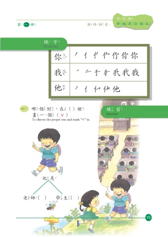 ㊞尼版 ㊞尼版 新編華語課本 漢語拼音 第㆒冊 第㆒冊 漢語拼音 新編華語課本 識 字 Vocabulary 你 我 他 ㆒ 哪個對,在()裡 練 習 畫㆒個(ˇ) Exercise To choose the proper one and mark "V" in. 他是 老師( ) ㈻生( ) 9 10