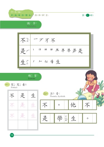 ㊞尼版 ㊞尼版 新編華語課本 漢語拼音 第㆒冊 第㆒冊 漢語拼音 新編華語課本 識 字 Vocabulary 不 是 生 練 習 Exercise ㆒ ㊢ ㊢ 看 Portrait 不 是 生 ㆓ ㊟ 音 Phonetic Symbols 不 。 他 不 ㈻ 是 學 生 。 13 14