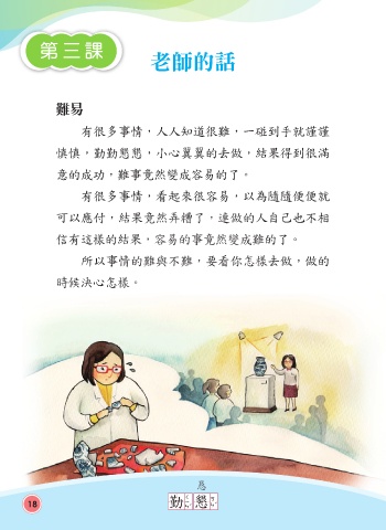 第三課 老師的話 難易 有很多事情,人人知道很難,一碰到手就謹謹 慎慎,勤勤懇懇,小心翼翼的去做,結果得到很滿 意的成功,難事竟然變成容易的了。 有很多事情,看起來很容易,以為隨隨便便就 可以應付,結果竟然弄糟了,連做的人自己也不相 信有這樣的結果,容易的事竟然變成難的了。 所以事情的難與不難,要看你怎樣去做,做的 時候決心怎樣。 懇 18 勤懇