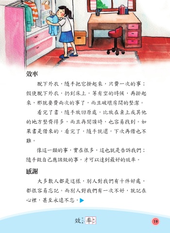 效率 脫下外衣,隨手把它掛起來,只費一次的事; 假使脫下外衣,扔到床上,等有空的時候,再掛起 來,那就要費兩次的事了,而且破壞房間的整潔。 看完了書,隨手放回原處,比放在桌上或其他 的地方整齊得多,而且再閱讀時,也容易找到。如 果書是借來的,看完了,隨手就還,下次再借也不 難。 像這一類的事,實在很多,這也就是告訴我們; 隨手做自己應該做的事,才可以達到最好的效率。 感謝 大多數人都是這樣,別人對我們有十件好處, 都很容易忘記。而別人對我們有一次不好,就記在 心裡,甚至永遠不忘。 效率 19