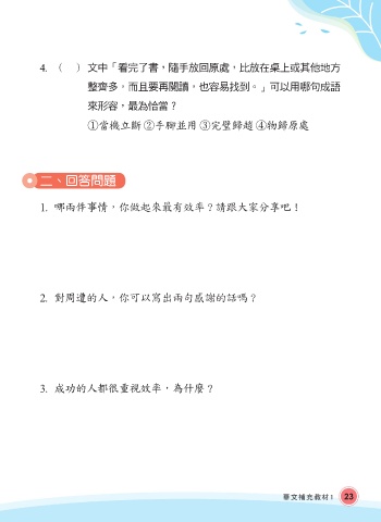 4. ( ) 文中「看完了書,隨手放回原處,比放在桌上或其他地方 整齊多,而且要再閱讀,也容易找到。」可以用哪句成語 來形容,最為恰當? Ǻ當機立斷 ǻ手腳並用 Ǽ完璧歸趙 ǽ物歸原處 二、回答問題 1. 哪兩件事情,你做起來最有效率?請跟大家分享吧! 2. 對周遭的人,你可以寫出兩句感謝的話嗎? 3. 成功的人都很重視效率,為什麼? 華文補充教材1 23