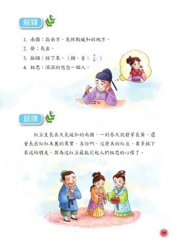 解釋 1. 南國:指南方,氣候較暖和的地方。 2. 發:長出。 3. 採擷:採下來。(擷,音:節) 4. 相思:深深的想念一個人。 語譯 紅豆生長在天氣暖和的南國,一到春天就發芽長葉,還 會長出紅紅美麗的果實。各位啊,這麼美的紅豆,要多採下 來送給朋友,因為這紅豆最能引起人們相思的心情了。 39