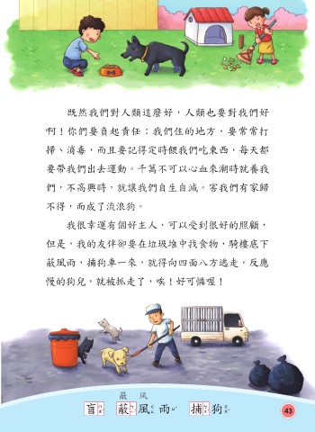 既然我們對人類這麼好,人類也要對我們好 啊!你們要負起責任:我們住的地方,要常常打 掃、消毒,而且要記得定時餵我們吃東西,每天都 要帶我們出去運動。千萬不可以心血來潮時就養我 們,不高興時,就讓我們自生自滅。害我們有家歸 不得,而成了流浪狗。 我很幸運有個好主人,可以受到很好的照顧, 但是,我的友伴卻要在垃圾堆中找食物,騎樓底下 蔽風雨,捕狗車一來,就得向四面八方逃走,反應 慢的狗兒,就被抓走了,唉!好可憐喔! 蔽 風 盲 蔽風雨 捕狗 43