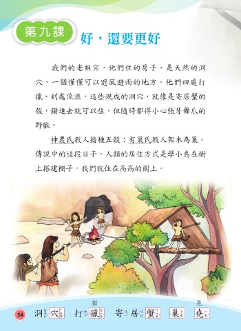 第九課 好,還要更好 我們的老祖宗,他們住的房子,是天然的洞 穴,一個僅僅可以遮風避雨的地方。他們四處打 獵,到處流浪,這些現成的洞穴,就像是寄居蟹的 殼,鑽進去就可以住,但隨時都得小心張牙舞爪的 野獸。 神農氏教人播種五榖;有巢氏教人架木為巢。 傳說中的這段日子,人類的居住方式是學小鳥在樹 上搭建棚子,我們就住在高高的樹上。 獵 堯 54 洞穴 打獵 寄居蟹 巢 堯