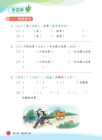 學習單 一、照樣造句 1. (山上)有(老虎),經常(傷害老百姓)。 (1)( )有( ),經常( )。 (2)( )有( ),經常( )。 2. (人)只怕沒有(志氣),不必擔心沒有(成就)。 (1) ( )只怕沒有( ),不必擔心沒有 ( )。 (2) ( )只怕沒有( ),不必擔心沒有 ( )。 3. (老虎)、(大蛟)、(周處)合稱為(三害)。 (1) ( )、( )、( )合稱為 ( )。 (2) ( )、( )、( )、( ) 合稱為四季。 22 第三課 周處除三害