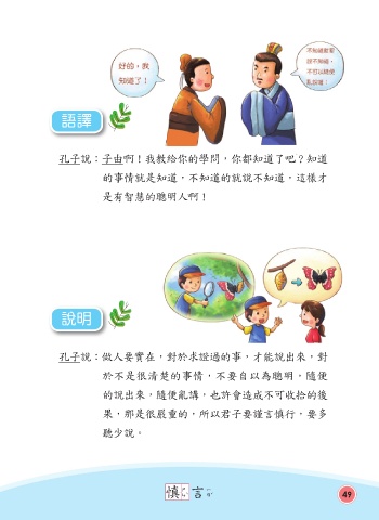 語譯 孔子說: 子由啊!我教給你的學問,你都知道了吧?知道 的事情就是知道,不知道的就說不知道,這樣才 是有智慧的聰明人啊! 說明 孔子說: 做人要實在,對於求證過的事,才能說出來,對 於不是很清楚的事情,不要自以為聰明,隨便 的說出來,隨便亂講,也許會造成不可收拾的後 果,那是很嚴重的,所以君子要謹言慎行,要多 聽少說。 慎言 49