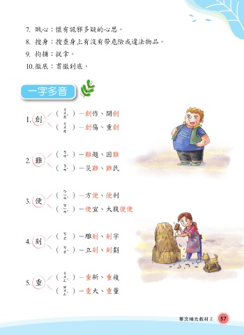 7. 賊心:懷有詭邪多疑的心思。 8. 搜身:搜查身上有沒有帶危險或違法物品。 9. 拘捕:捉拿。 10. 徹底:貫徹到底。 一字多音 (創)-創作、開創 1. 創 (創 )-創傷、重創 (難)-難題、困難 2. 難 (難)-災難、難民 (便)-方便、便利 3. 便 (便)-便宜、大腹便便 (刻)-雕刻、刻字 4. 刻 (刻)-立刻、刻劃 (重)-重新、重複 5. 重 (重)-重大、重量 華文補充教材2 57