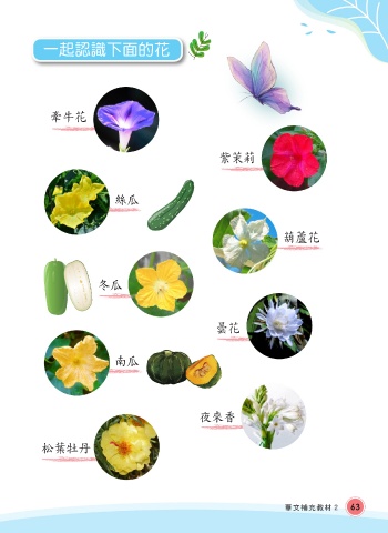 一起認識下面的花 牽牛花 紫茉莉 絲瓜 葫蘆花 冬瓜 曇花 南瓜 夜來香 松葉牡丹 華文補充教材2 63