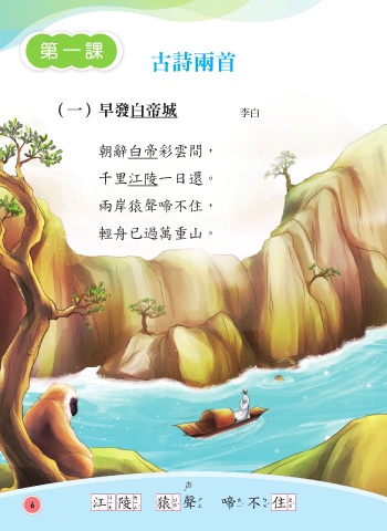 第一課 古詩兩首 (一)早發白帝城 李白 朝辭白帝彩雲間, 千里江陵一日還。 兩岸猿聲啼不住, 輕舟已過萬重山。 聲 6 江陵 猿聲 啼不住