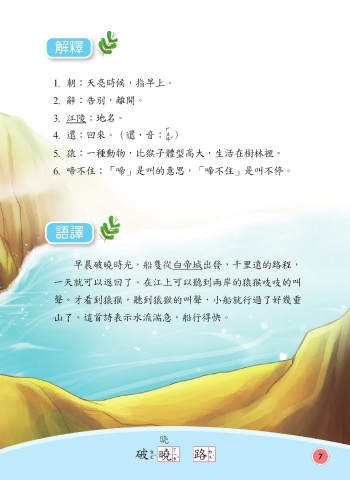 解釋 1. 朝:天亮時候,指早上。 2. 辭:告別,離開。 3. 江陵:地名。 4. 還:回來。(還,音:環) 5. 猿:一種動物,比猴子體型高大,生活在樹林裡。 6. 啼不住:「啼」是叫的意思,「啼不住」是叫不停。 語譯 早晨破曉時光,船隻從白帝城出發,千里遠的路程, 一天就可以返回了。在江上可以聽到兩岸的猿猴吱吱的叫 聲。才看到猿猴,聽到猿猴的叫聲,小船就行過了好幾重 山了。這首詩表示水流湍急,船行得快。 曉 破曉 路 7