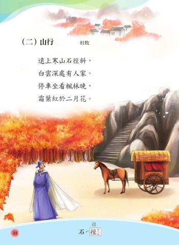 (二)山行 杜牧 遠上寒山石徑斜, 白雲深處有人家。 停車坐看楓林晚, 霜葉紅於二月花。 徑 32 石徑