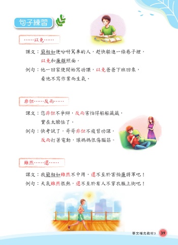 句子練習 ……以免…… 課文: 藺相如便吩咐駕車的人,趕快躲進一條巷子裡, 以免和廉頗照面。 例句: 他一回家便開始寫功課,以免爸爸下班回來, 看他不寫作業而生氣。 非但……反而…… 課文: 您非但不爭辯,反而害怕得躲躲藏藏, 實在太膽怯了。 例句: 快考試了,哥哥非但不複習功課, 反而打著電動,讓媽媽很傷腦筋。 雖然……還…… 課文: 我藺相如雖然不中用,還不至於害怕廉將軍吧! 例句: 天氣雖然很熱,還不至於有人不穿衣服上街吧! 華文補充教材3 39