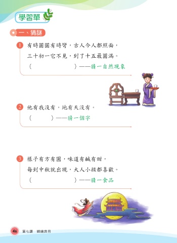 學習單 一、猜謎 1 有時圓圓有時彎,古人今人都照面, 三十初一它不見,到了十五最圓滿。 ( )——猜一自然現象 2 他有我沒有,地有天沒有。 ( )——猜一個字 3 樣子有方有圓,味道有鹹有甜, 每到中秋就出現,大人小孩都喜歡。 ( )——猜一食品 46 第七課 嫦娥奔月