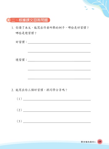 二、 根據課文回答問題 1. 你讀了本文,能寫出作者所舉的例子,哪些是好習慣? 哪些是壞習慣? 好習慣: 壞習慣: 2. 能寫出你三個好習慣,跟同學分享嗎? (1) (2) (3) 華文補充教材3 59