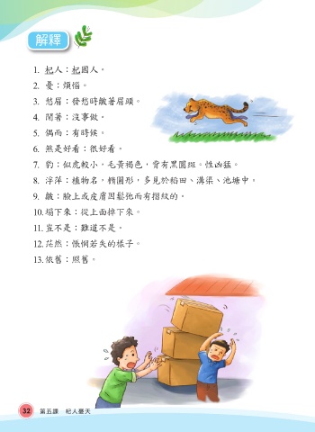 解釋 1. 杞人:杞國人。 2. 憂:煩惱。 3. 愁眉:發愁時皺著眉頭。 4. 閒著:沒事做。 5. 偶而:有時候。 6. 煞是好看:很好看。 7. 豹:似虎較小,毛黃褐色,背有黑圓斑。性凶猛。 8. 浮萍:植物名,橢圓形,多見於稻田、溝渠、池塘中。 9. 皺:臉上或皮膚因鬆弛而有摺紋的。 10. 塌下來:從上面掉下來。 11. 豈不是:難道不是。 12. 茫然:悵惘若失的樣子。 13. 依舊:照舊。 32 第五課 杞人憂天
