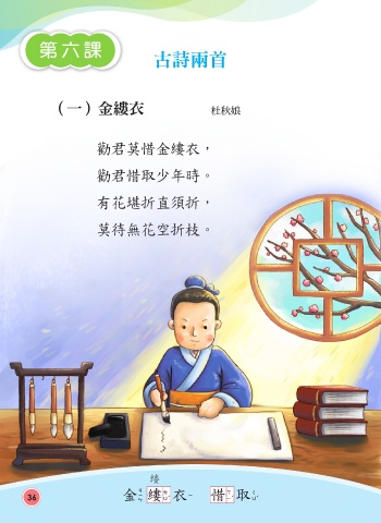 第六課 古詩兩首 (一)金縷衣 杜秋娘 勸君莫惜金縷衣, 勸君惜取少年時。 有花堪折直須折, 莫待無花空折枝。 縷 36 金縷衣 惜取