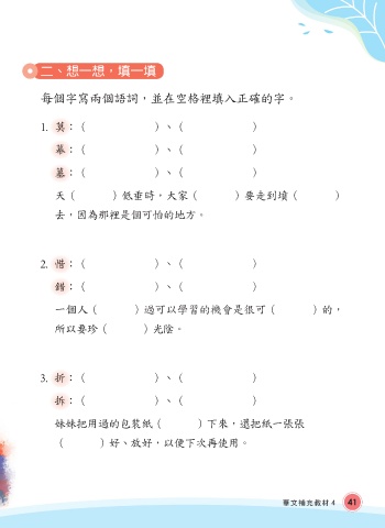 二、想一想,填一填 每個字寫兩個語詞,並在空格裡填入正確的字。 1. 莫:( )、( ) 幕:( )、( ) 墓:( )、( ) 天( )低垂時,大家( )要走到墳( ) 去,因為那裡是個可怕的地方。 2. 惜:( )、( ) 錯:( )、( ) 一個人( )過可以學習的機會是很可( )的, 所以要珍( )光陰。 3. 折:( )、( ) 拆:( )、( ) 妹妹把用過的包裝紙( )下來,還把紙一張張 ( )好、放好,以便下次再使用。 華文補充教材4 41