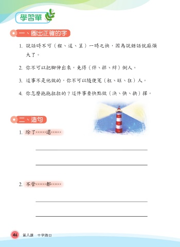 學習單 一、圈出正確的字 1. 說話時不可(程、逞、呈)一時之快,因為說錯話就麻煩 大了。 2. 你不可以把腳伸出來,免得(伴、拌、絆)倒人。 3. 這事不是他做的,你不可以隨便冤(枉、旺、狂)人。 4. 你怎麼拖拖拉拉的?這件事要快點做(決、快、抉)擇。 二、造句 1. 除了⋯⋯還⋯⋯ 2. 不管⋯⋯都⋯⋯ 46 第八課 十字路口