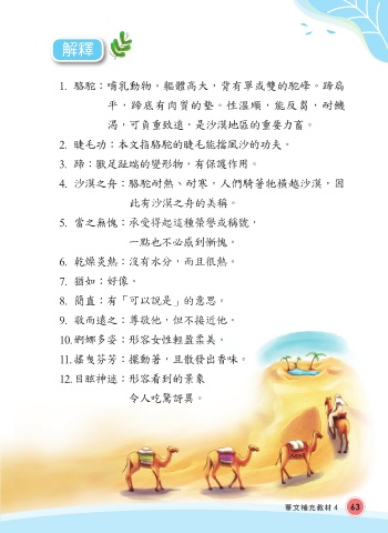 2. 睫毛功:本文指駱駝的睫毛能擋風沙的功夫。