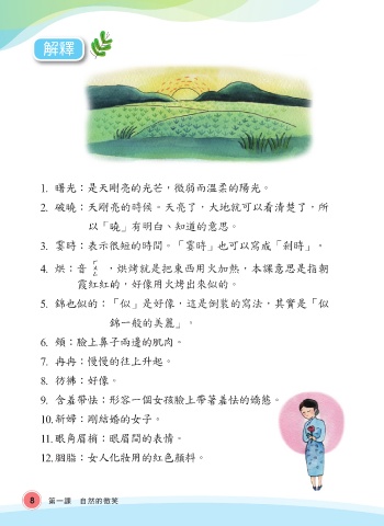 1. 曙光:是天剛亮的光芒,微弱而溫柔的陽光。