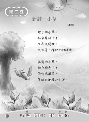 第二課 新詩—小草 朱自清 睡了的小草, 如今蘇醒了! 立在太陽裡, 欠伸著,揉他們的眼睛。 萎黃的小草, 如今綠色了! 俯仰惠風前, 笑瞇瞇地彼此向著。 詩 萎 黃 12 新詩 欠伸 揉 萎黃