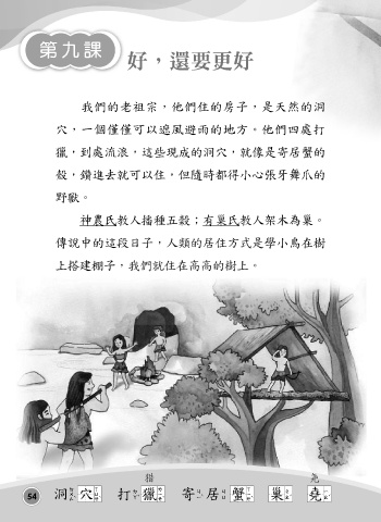 第九課 好,還要更好 我們的老祖宗,他們住的房子,是天然的洞 穴,一個僅僅可以遮風避雨的地方。他們四處打 獵,到處流浪,這些現成的洞穴,就像是寄居蟹的 殼,鑽進去就可以住,但隨時都得小心張牙舞爪的 野獸。 神農氏教人播種五榖;有巢氏教人架木為巢。 傳說中的這段日子,人類的居住方式是學小鳥在樹 上搭建棚子,我們就住在高高的樹上。 獵 堯 54 洞穴 打獵 寄居蟹 巢 堯