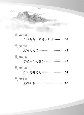 第六課 古詩兩首:雜詩/紅豆 .......... . 36 第七課 黑狗兄的話 ........................... . 42 第八課 睿智公正的包公 .................... . 48 第九課 好,還要更好 . ....................... . 54 第十課 60 愛心毛衣 ..............................